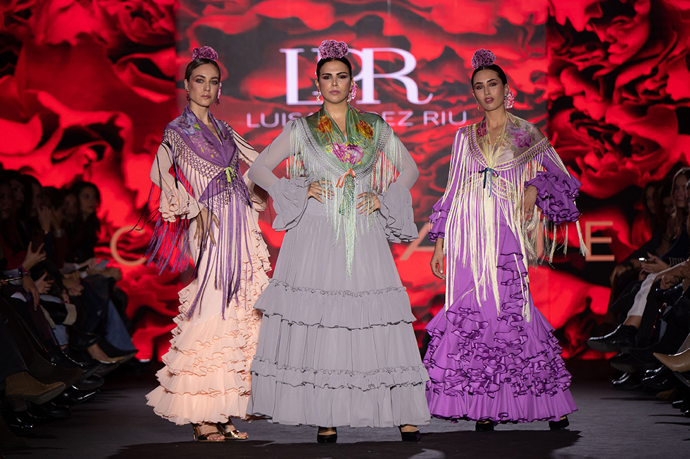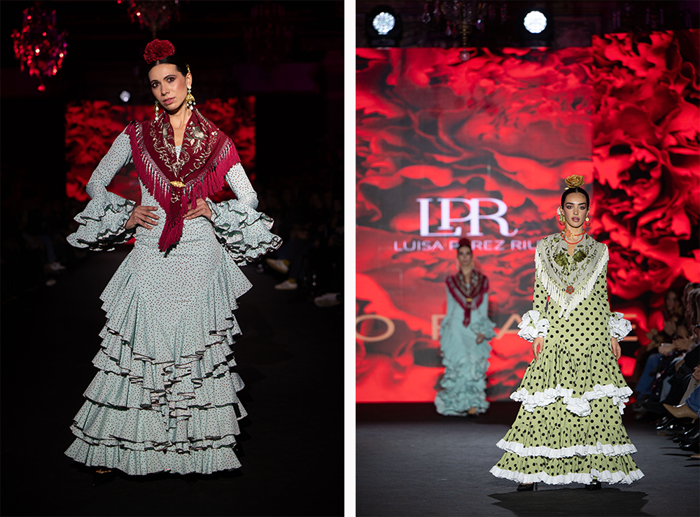 Los volantes forman parte del modo de expresión de Luisa Pérez Riu. Suben a una sola cadera o a ambos costados formando picos, cascadas que bambolean a cada paso. La diseñadora también presenta algunos volantes fruncidos y los rematan con las tradicionales tiras bordadas que tanto embellecen los trajes.