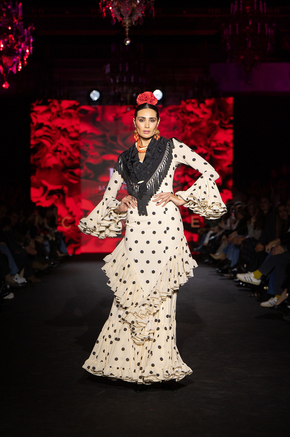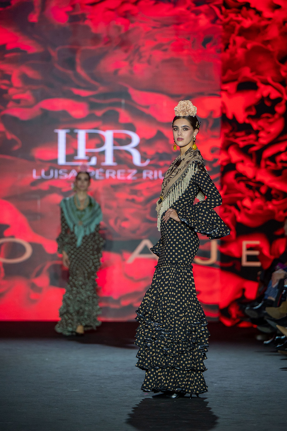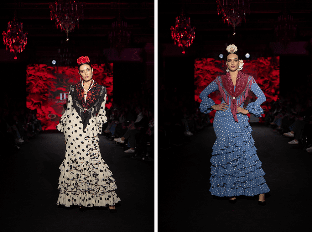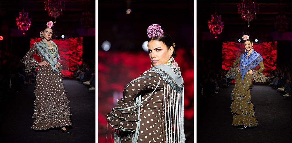 En Coraje Luisa Pérez Riu respeta profundamente a la flamenca clásica, esa flamenca de lunares, de tiras bordadas, de tejidos que acompañan y siluetas que no sólo sientan bien sino que elevan la gracia natural de nuestro tradicional traje de flamenca.
