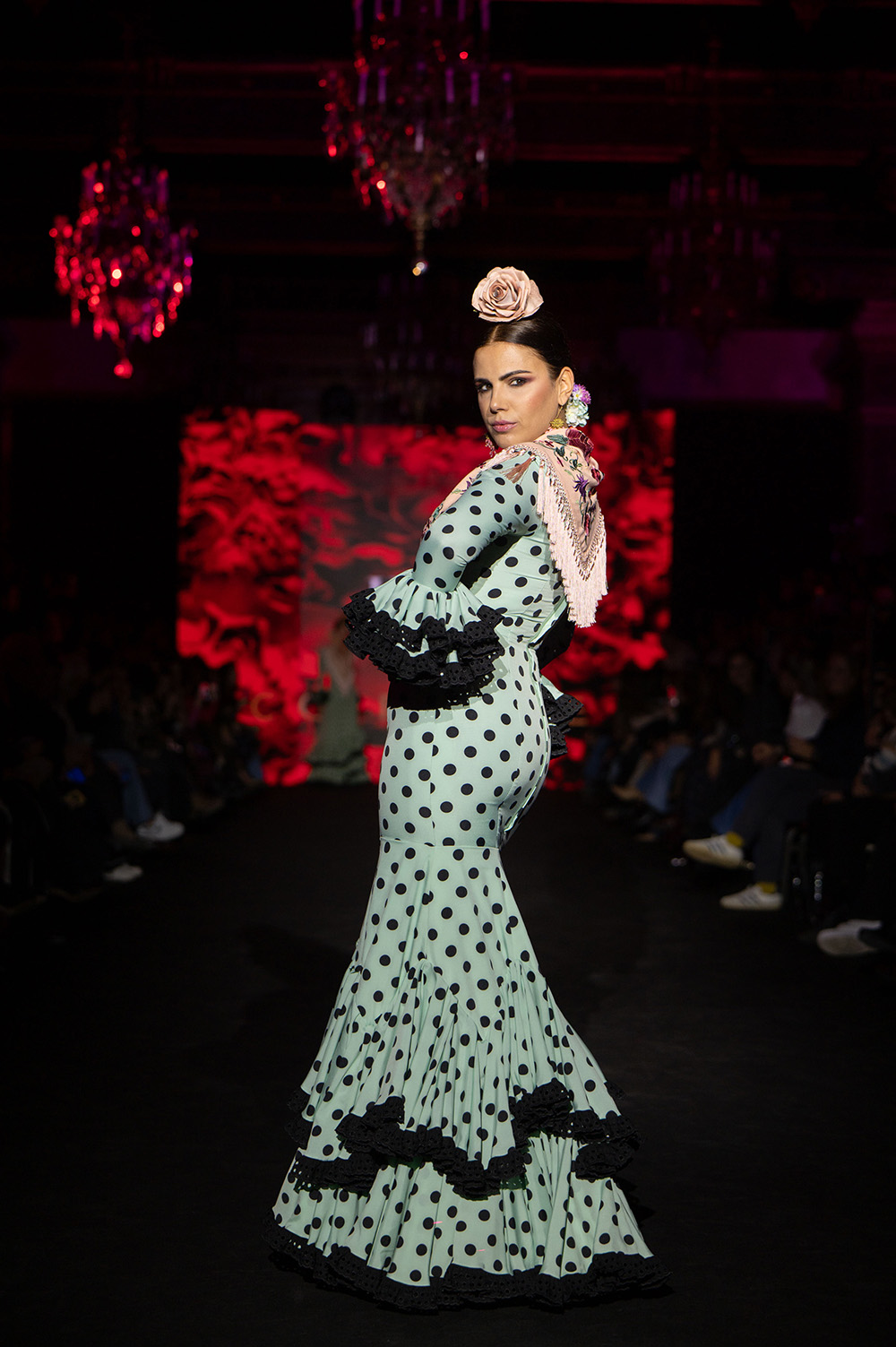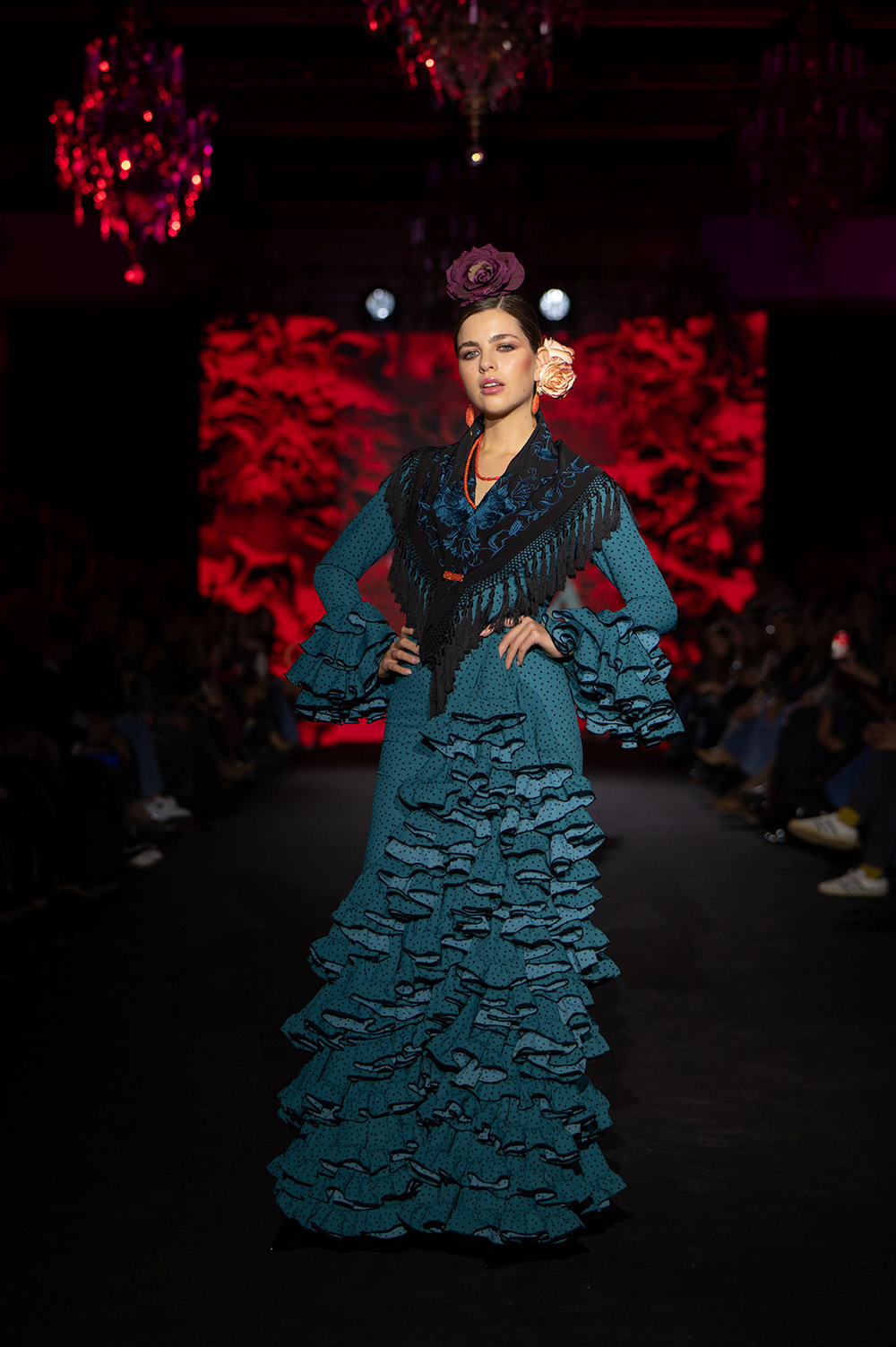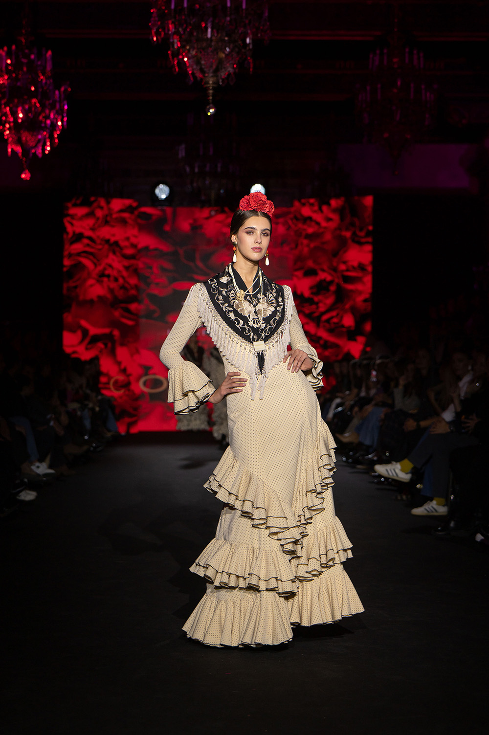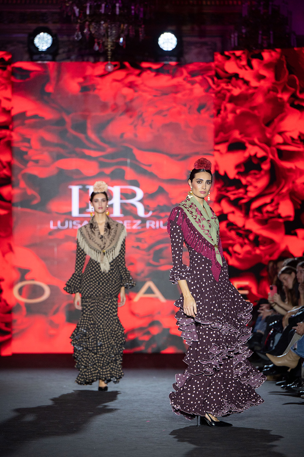 En Coraje Luisa Pérez Riu respeta profundamente a la flamenca clásica, esa flamenca de lunares, de tiras bordadas, de tejidos que acompañan y siluetas que no sólo sientan bien sino que elevan la gracia natural de nuestro tradicional traje de flamenca.