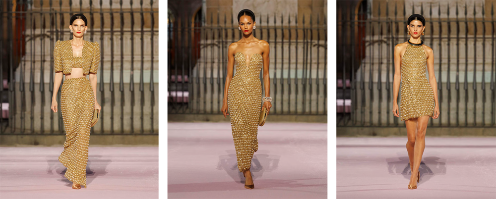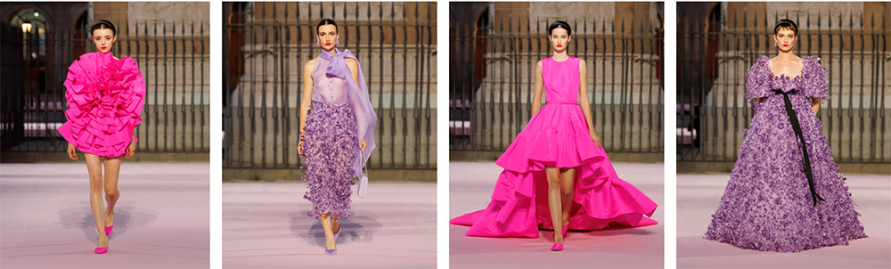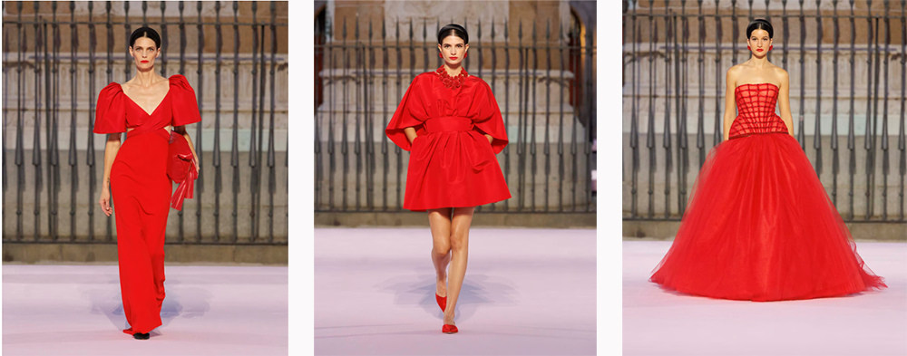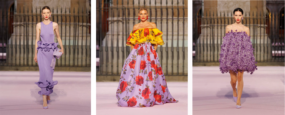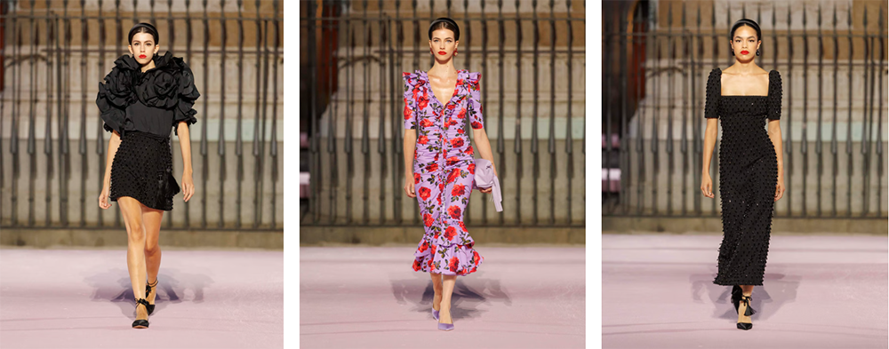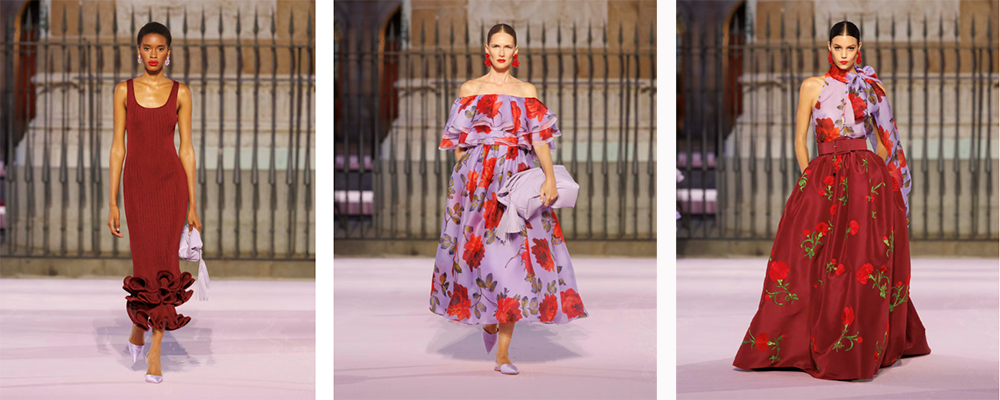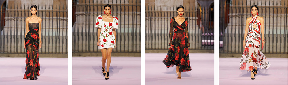 - Los estampados florales de rosas inspirados en los Jardines de El Retiro, especialmente los vestidos drapeados.