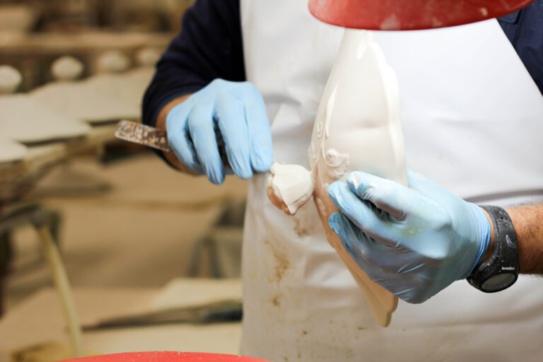 Una vez moldeada la pieza se repasa a cuchilla para así eliminar sobrantes y se refina con una esponja húmeda, todo ello a mano, de modo artesanal.