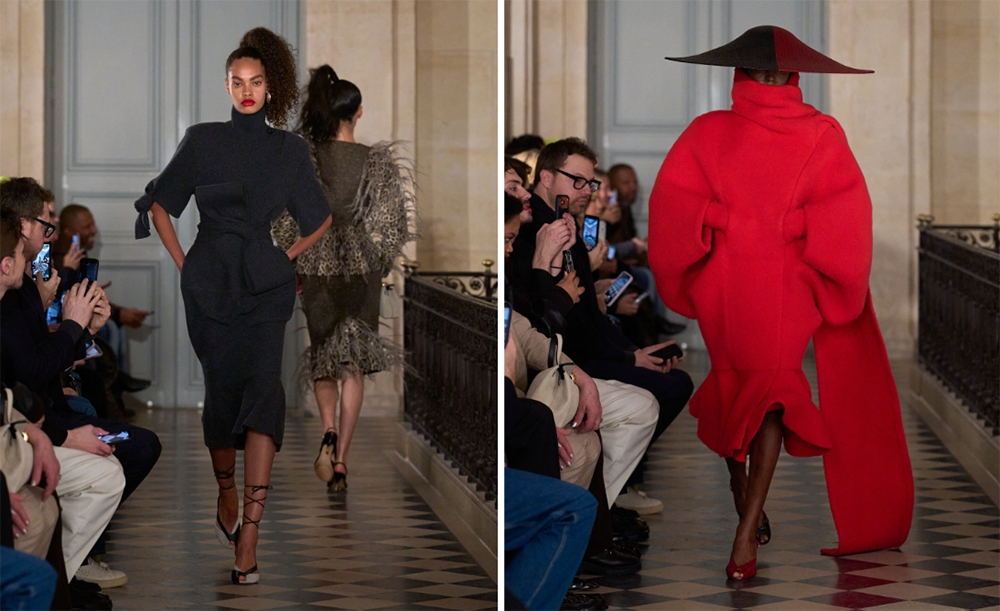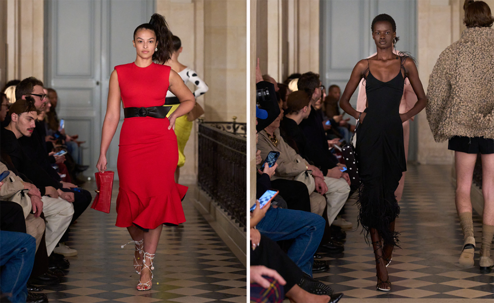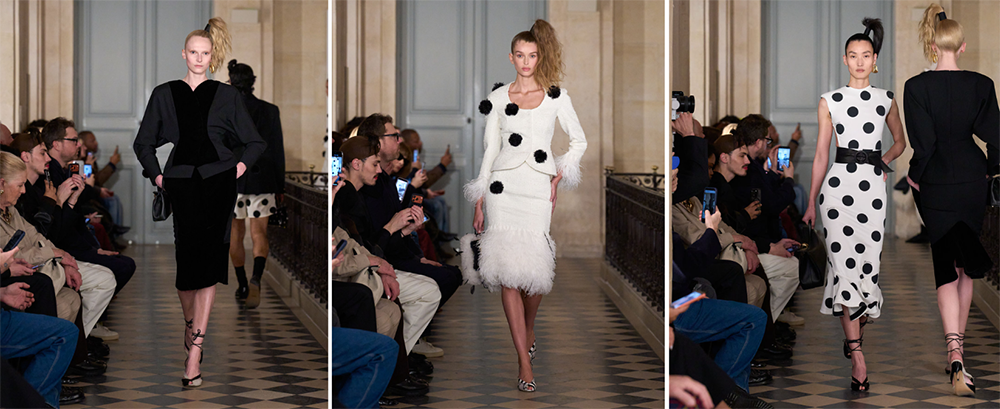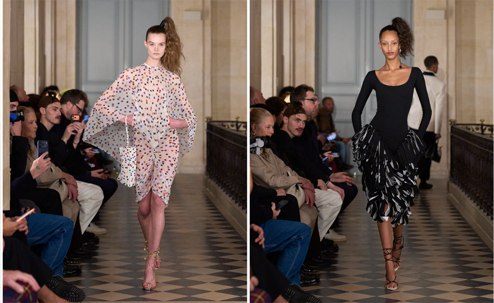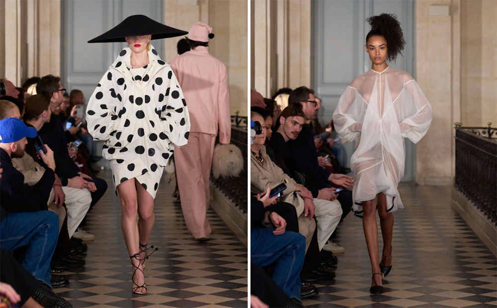 Los lunares en binomio ganador, blanco y negro, o en multicolor, conviven con lentejuelas y plumas y las transparencias contrastan con el uso de tejidos extragruesos como el utilizado para el abrigo rojo.