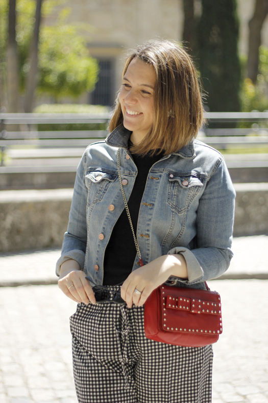 Este look está montado alrededor de una blusita en tejido ligero y abotonada tan propia del verano en color lima. La compré en rebajas y la verdad es que me he arrepentido de no haberla comprado también en otros colores porque ha resultado ser todo un comodín. A ella le sumé mis pantalones culottes de cuadros vichy que ya conoces de otras ocasiones. Y para el fresco de la noche mi cazadora de cuero. La verdad, es que es una de las mejores compras de mi armario. Tiene una piel suave, moldeable y muy cómoda, no pesa y además queda fenomenal con cualquier cosa que lleves.
